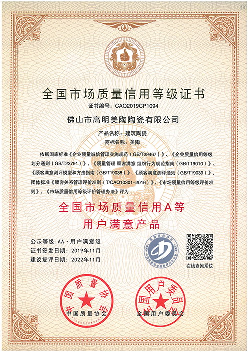 全國市場質量信用A等用戶滿意產品